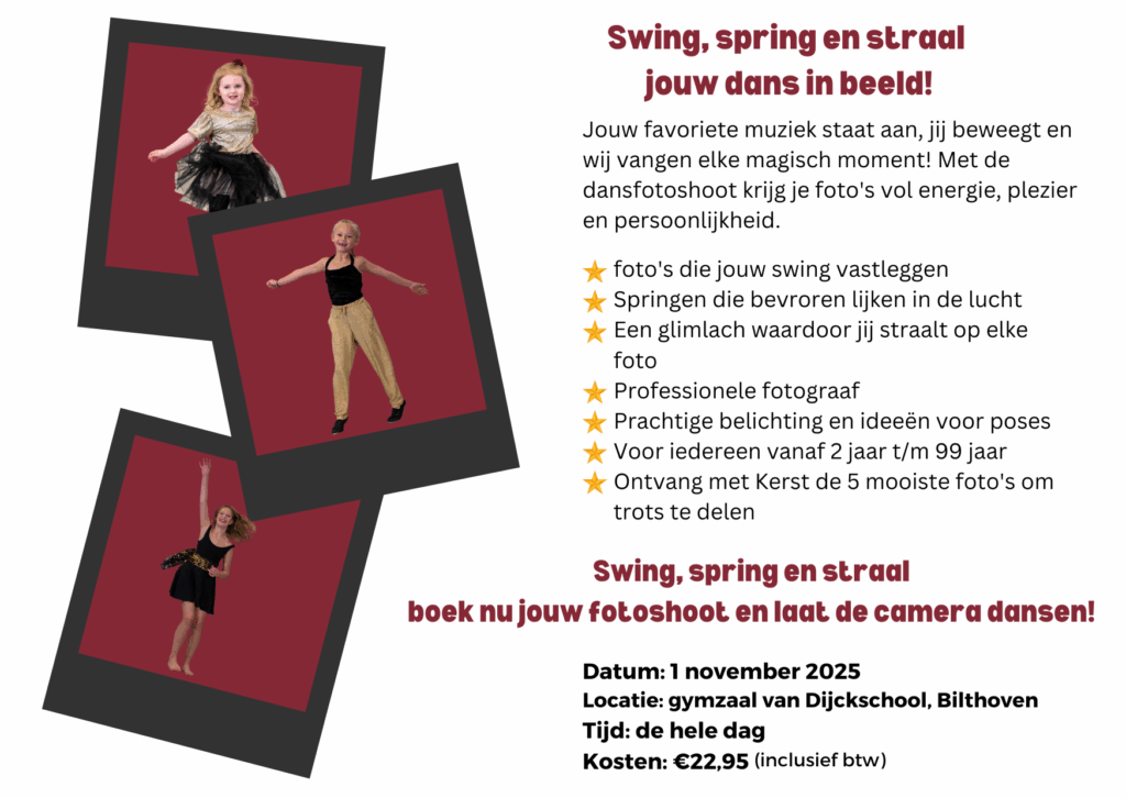 Wil je ook graag op de foto? Vul dit formulier in vóór maandag 27. oktober. Na deze datum wordt er een planning opgesteld, zodat iedereen op hun gewenste tijd gefotografeerd kan worden. De tijden zijn per half uur, en in dit half uur kunnen er meerdere dansers op de foto. Uiteraard ontvang je hiervan een bericht.
